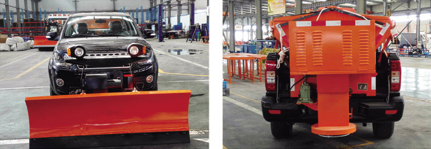 皮卡除雪车以多用途越野货车为底盘,配置前置除雪滚刷,后置动力系统;前置除雪铲、后置固体撒布机。除雪车结构合理可靠,技术先进,结构紧凑美观,装卸方便灵活;能适用于各种场合的除雪工作。