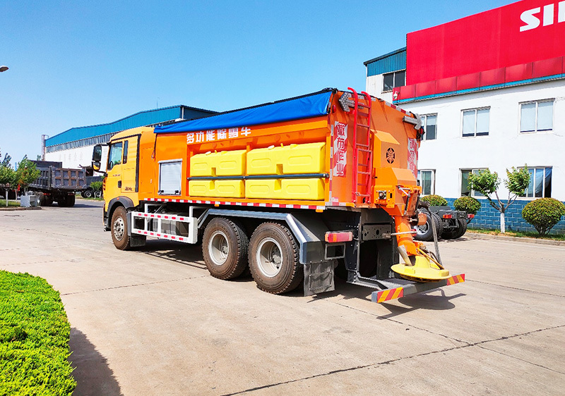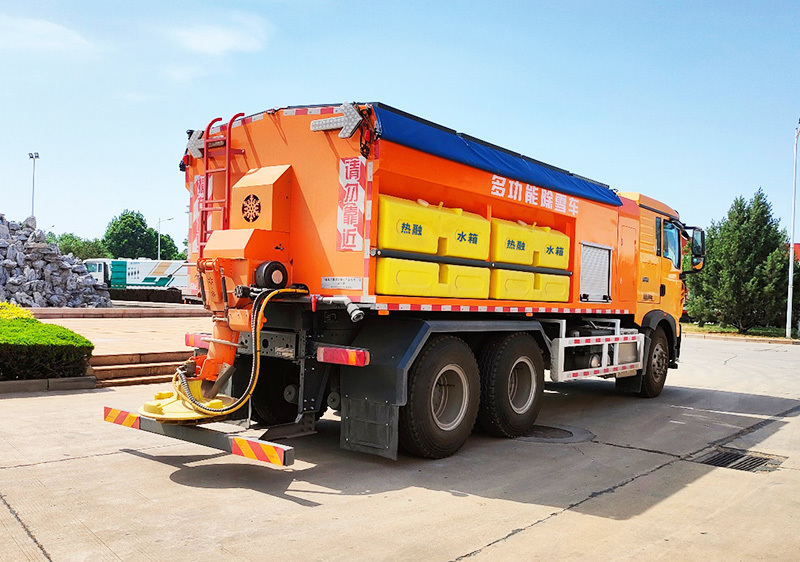 该多功能除雪车具有工信部公告、环保公告及免征,符合国家上牌标准。该车以载货汽车底盘为载体,整车由车辆底盘、撒布装置、预湿水箱、动力系统、控制系统、液压系统等组成;集撒布和除雪功能于一体,具有融雪剂撒布、预湿、路面积雪清扫等功能;可加装前置除雪铲/前置除雪滚刷(二者可互换)、后置撒布机;车辆配备ABS刹车系统、行车记录仪,具有低温冷启动功能;广泛应用于高速、市政、城乡道路等不同路面的除冰雪作业。